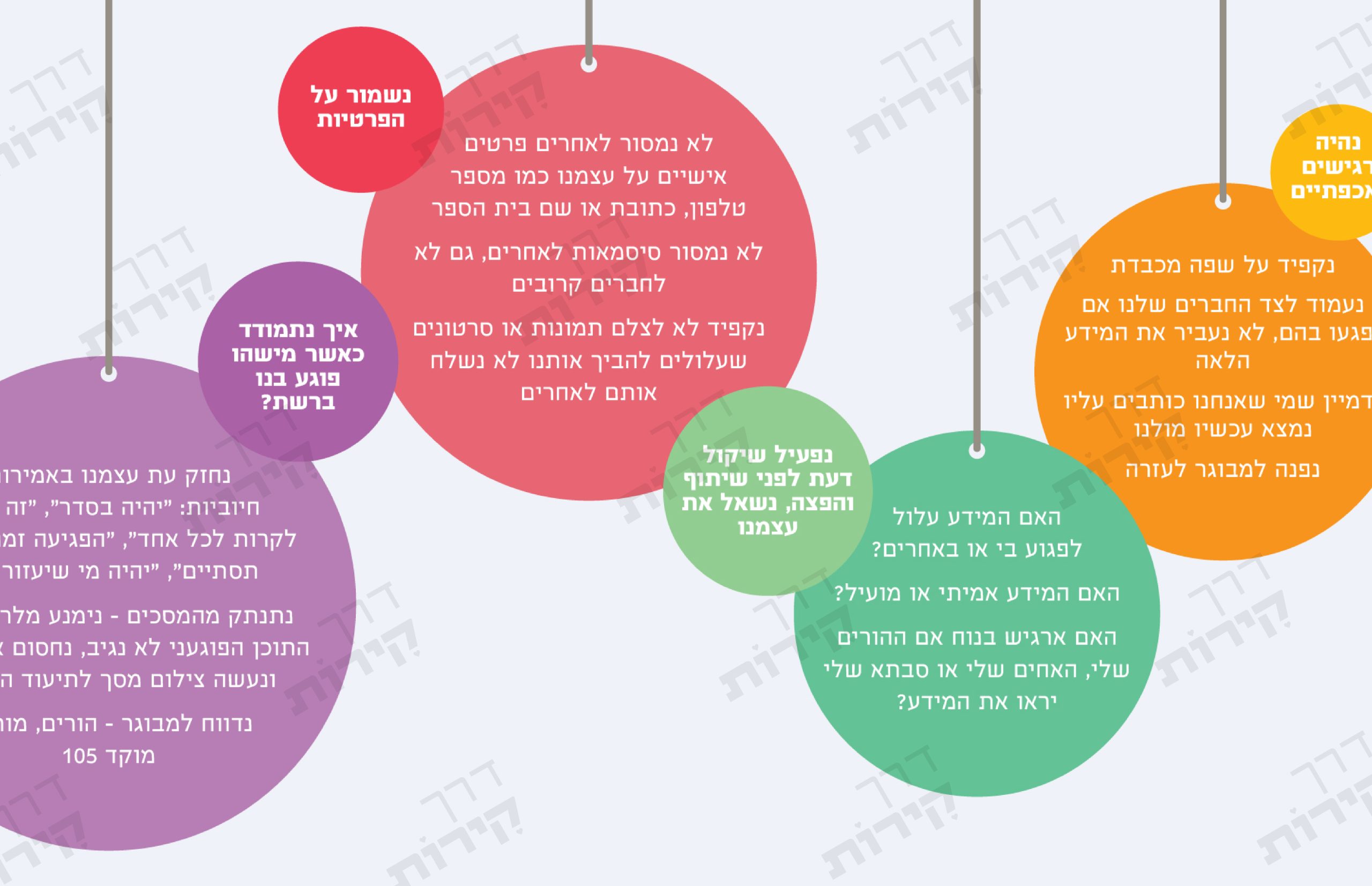 לדוגמה: מתי אין לחשוף מידע אישי, באילו מקרים עליהם להימנע מפתיחת קבצים מסוימים או לצפות בתוכן שאינו מתאים להם, איך לזהות תוכן לא ראוי ולמי עליהם לדווח במקרה שהם נחשפו לתוכן כזה או לפעילות מזיקה אחרת במרשתת.