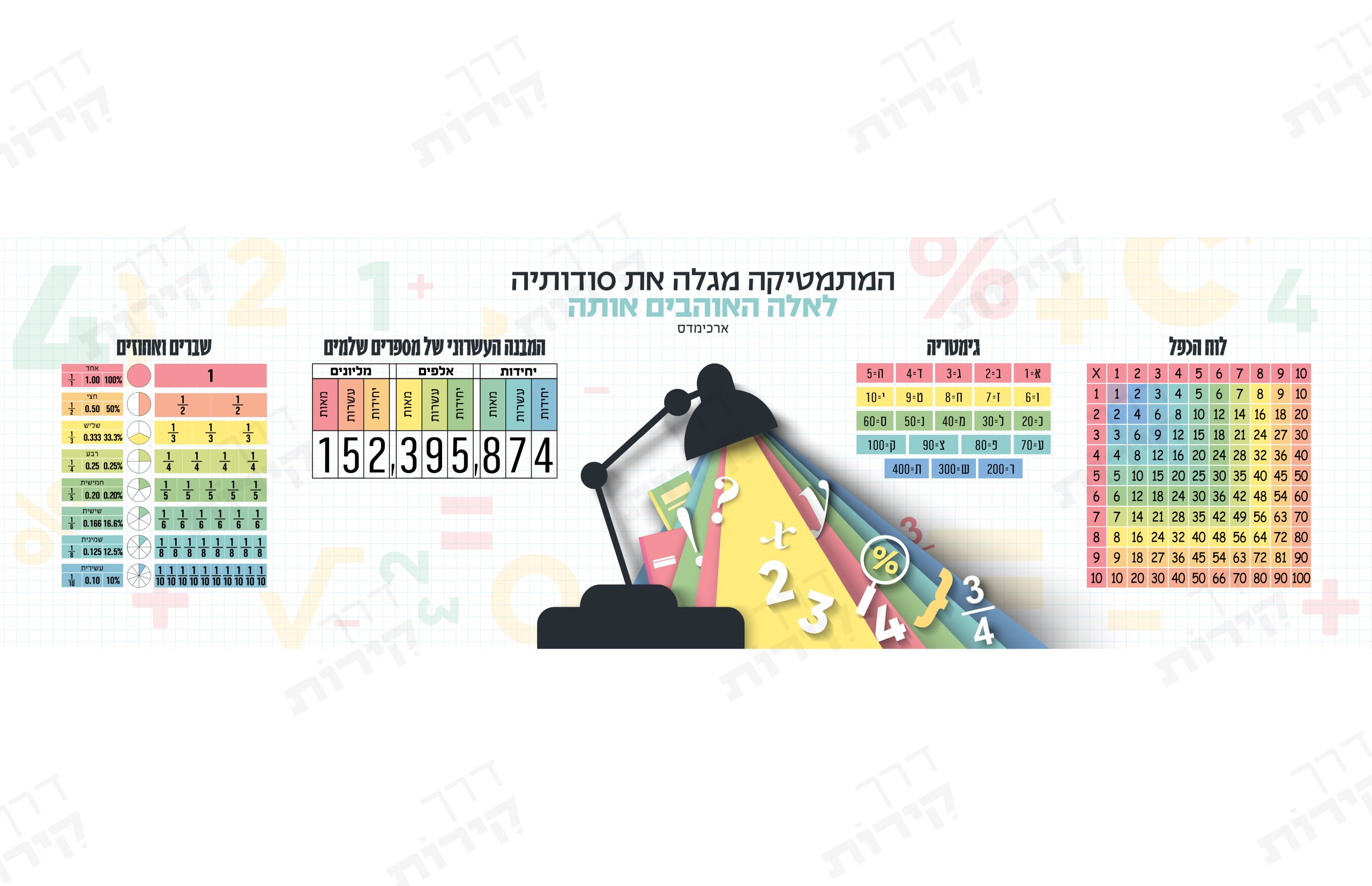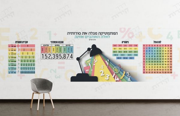 קיר תוכן עשיר וצבעוני להנגשת המתמטיקה לתלמידות והתלמידים; לוחות מעוצבים ושמישים – המחשת נושא השברים והאחוזים, לוח הכפל, לוח גימטרייה ופירוט המבנה העשרוני של מספרים שלמים. העיצוב מסייע לתלמידים להבין ולזכור בצורה חזותית וברורה את עקרונות הבסיס של החשבון.